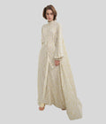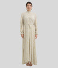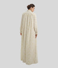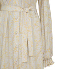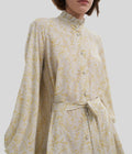 - Горловина з коміром-стійкою з декоровними складками. По низу рукавів резинка. Пояс знімний. Застібка на ґудзики.